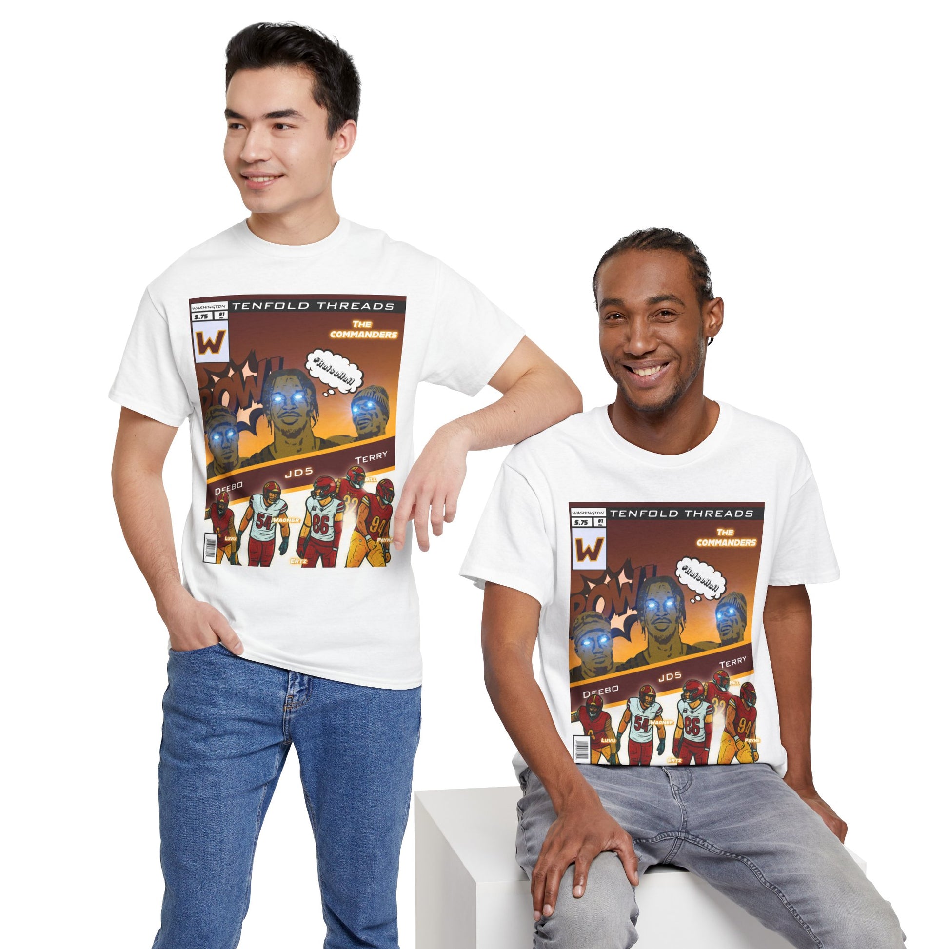 Celebrate the Washington Commanders Comic Book Graphic Tee, designed exclusively by Tenfold Threads. Featuring a collage-style design with powerful imagery, this shirt pays tribute to comic lovers and commies fans.